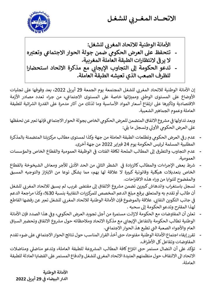 عبرت الأمانة الوطنية للاتحاد المغربي للشغل المجتمعة يوم الجمعة 29 أبريل 2022، عن تحفظها على العرض الحكومي ضمن جولة الحوار الاجتماعي واعتبرته لا يرقى لانتظارات الطبقة العاملة المغربية. ودعت بالمقابل حكومة أخنوش إلى التجاوب الإيجابي مع مطالب الاتحاد استحضارا للظرف الصعب الذي تعيشه الطبقة العاملة.