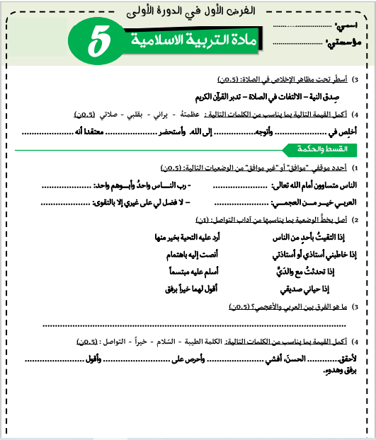 إمتحان الأول الدورة الأولى مادة الإسلامية للمستوى الخامس 2022-2023